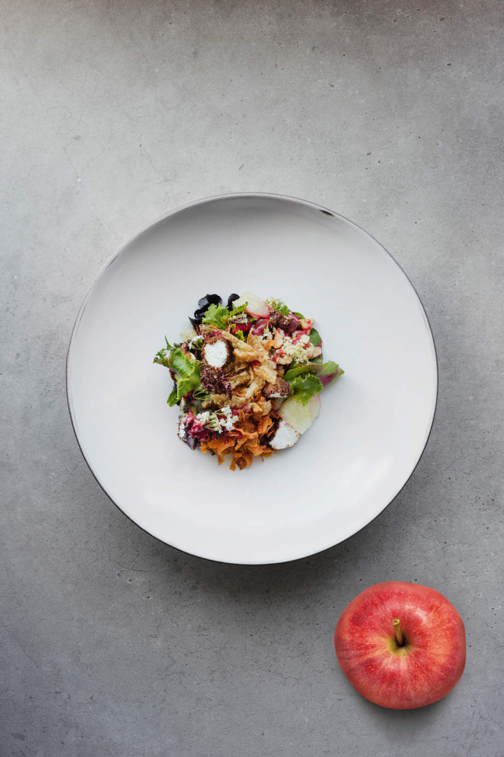 ΦΑΓΗΤΑΣΑΛΑΤΕΣΑνάμεικτη σαλάτα με άγρια βότανα, κατσικίσιο τυρί και μήλο