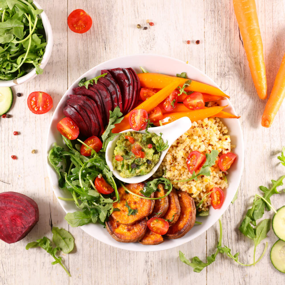Bowl με πλιγούρι, ψητά λαχανικά, παντζάρι και κρέμα αβοκάντο