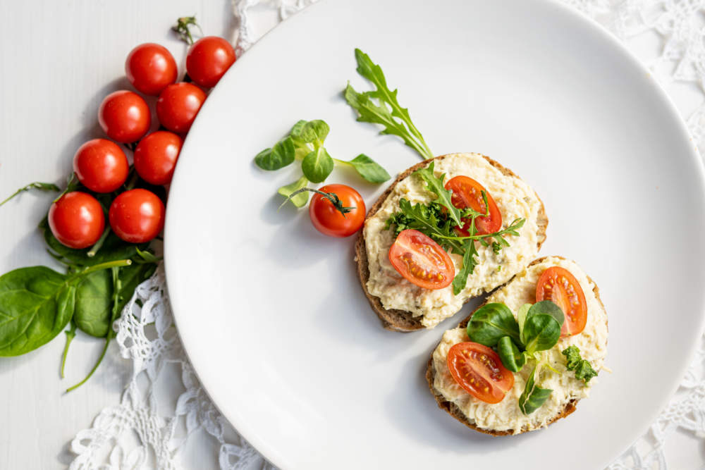 Απλώνουμε την αλοιφή γενναιόδωρα πάνω στο φρυγανισμένο ψωμί, προσθέτουμε τα ντοματίνια και ολοκληρώνουμε με φρέσκα φύλλα ρόκας ή μαρουλιού και λίγες σταγόνες ελαιόλαδου.