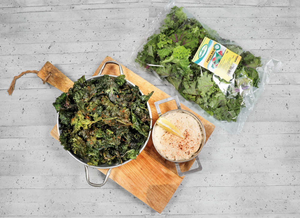 Σερβίρουμε τα kale chips μαζί με το δροσερό dip.