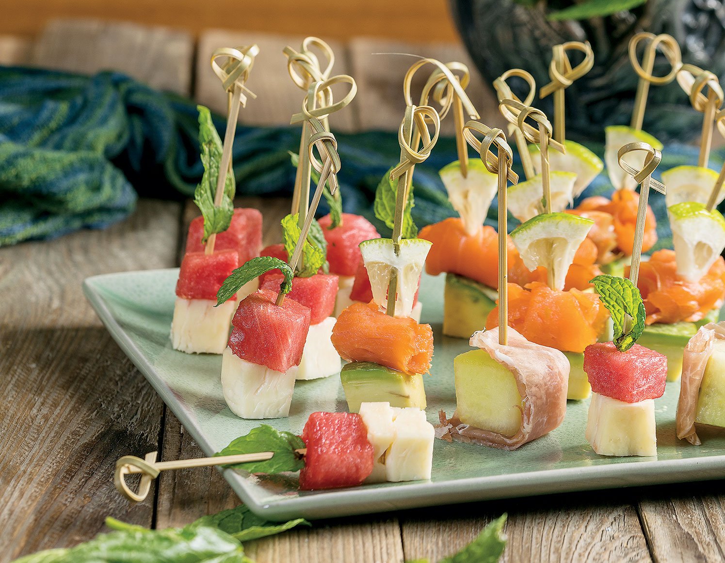 Κόβετε 8 µικρούς κύβους πεπόνι, ίδιους µε τους κύβους καρπουζιού. Αφαιρείτε το περισσό λίπος από το προσούτο, το κόβετε σε λωρίδες πλάτους 2 ½ -3 εκ. και τυλίγετε το πεπόνι. Καρφώνετε τους κύβους µε οδοντογλυφίδες.