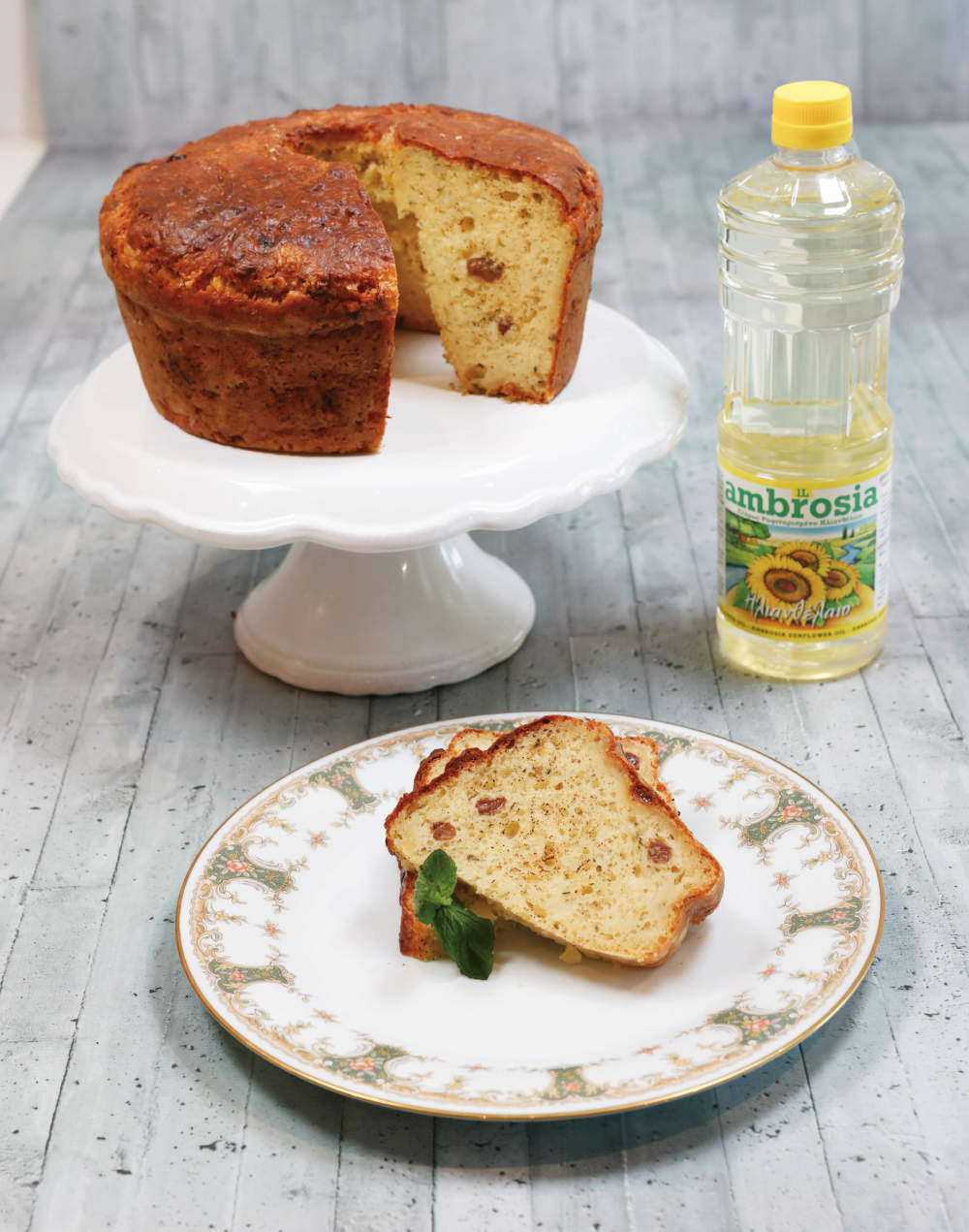 Προσθέτουμε μετά στο μίγμα το ηλιανθέλαιο, το γάλα και το γιαούρτι και ανακατεύουμε καλά. Συνεχίζουμε προσθέτοντας το σιμιγδάλι, το αλεύρι, το μπέικιν πάουντερ, την κανέλα, τη μαστίχα, το μέχλεπι, τον ξηρό δυόσμο, τα σταφιδάκια και ανακατεύουμε για ακόμη ένα λεπτό σε μέτρια ταχύτητα.