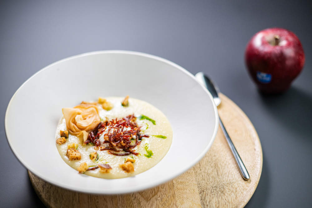 Κρέμα μήλου red delicious και σέλερι με ποσέ αυγό, φιλέτο ζαμπόν και άνθη μήλου