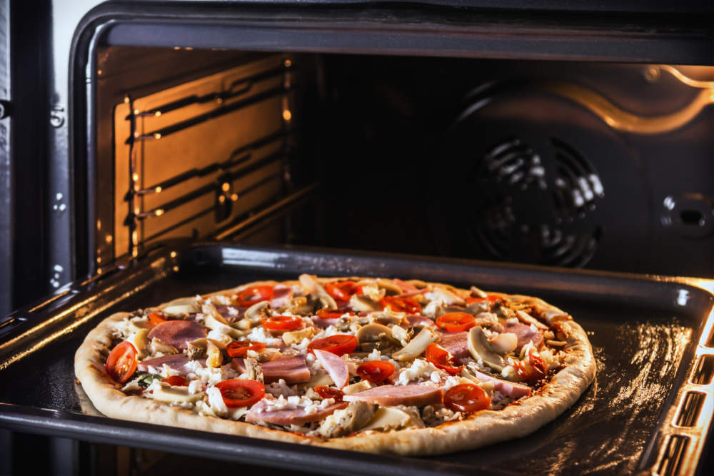 Βάζουμε την πίτσα στον προθερμασμένο φούρνο στους 220°C (ή 200°C σε φούρνο με αέρα) και τη ψήνουμε για περίπου 12-15 λεπτά, ή μέχρι να λιώσει το τυρί και η ζύμη να αποκτήσει χρυσαφένιο και τραγανό χρώμα.