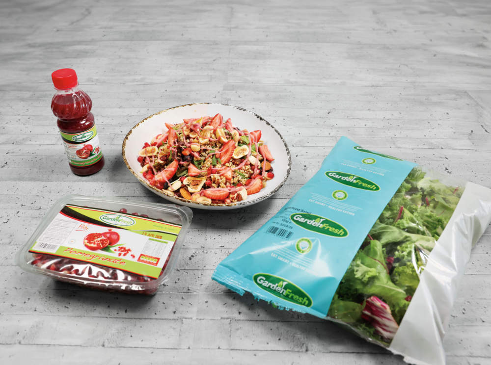 Σε μεγάλο μπολ ανακατεύουμε την κρύα κινόα με το Superfood Salad Garden Fresh, τα παστά φρούτα, τις φράουλες και  τους ξηρούς καρπούς και τους σπόρους ροδιού.