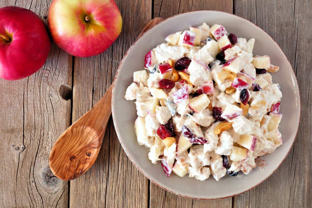 Σε ένα μεγάλο μπολ, προσθέτουμε το ψημένο κοτόπουλο κομμένο σε μικρά κομμάτια, τα κομμένα μήλα, τα cranberries, τα καρύδια και τις σταφίδες (προαιρετικά). Ρίχνουμε τη σάλτσα πάνω από τα υλικά και ανακατεύουμε καλά για να καλυφθούν όλα τα υλικά.