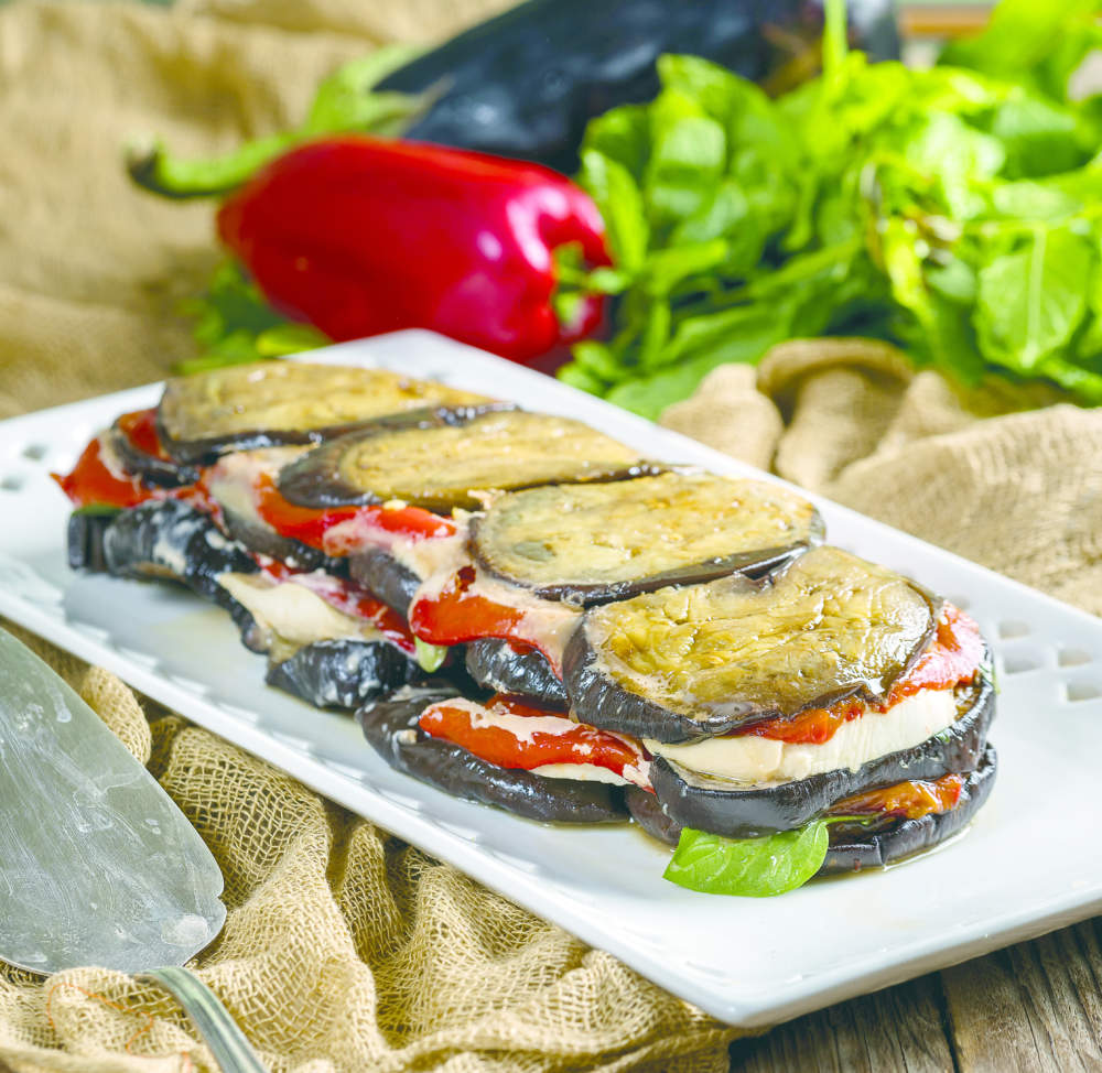 Ντύνετε µια µακρόστενη φόρµα για κέικ µε πλαστική µεµβράνη, βάζοντας δυο κοµµάτια σταυρωτά και αφήνοντας τις άκρες να εξέχουν στα πλευρά. Ετοιµάζετε τις µελιτζάνες: Τις κόβετε σε ροδέλες πάχους 1 εκ. περίπου και διαλέγετε τις µεγαλύτερες και πιο οµοιόµορφες σε µέγεθος (πρέπει να έχετε αρκετές ώστε να κάνετε 3 στρώσεις µε ροδέλες στη φόρµα). Τις πασπαλίζετε µε αλάτι και τις κρατάτε σε σουρωτήρι για ½ περίπου ώρα, µέχρι να κατεβάσουν το νερό τους.