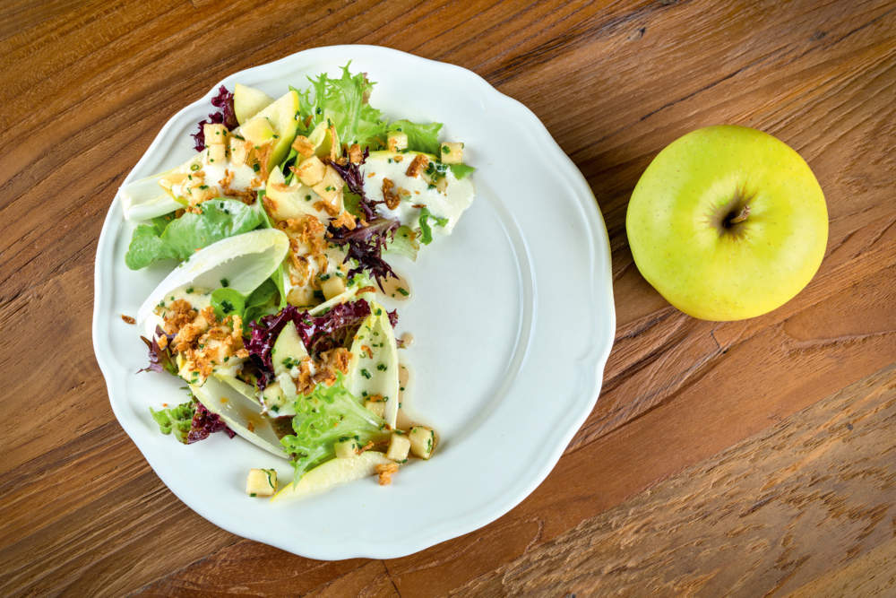 Καθαρίστε τα φύλλα σαλάτας και τα κεφάλια αντίδι. Κόψτε τα μήλα σε λεπτές λωρίδες. Κόψτε τα μήλα σε μικρούς κύβους και ανακατέψτε τα με όλα τα υπόλοιπα υλικά της βινεγκρέτ.